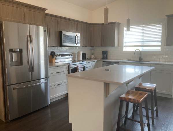 3 bedroom, 2 bath upper duplex in Westgate. Very comfortable suite with large, fully equipped kitchen, huge master bedroom with king bed and ensuite bathroom, tv’s in all 3 bedrooms, deck with propane bbq and the added bonus of a single attached garage. Westgate is a great neighborhood just a short drive from Walmart, Costco and multiple dining establishments.